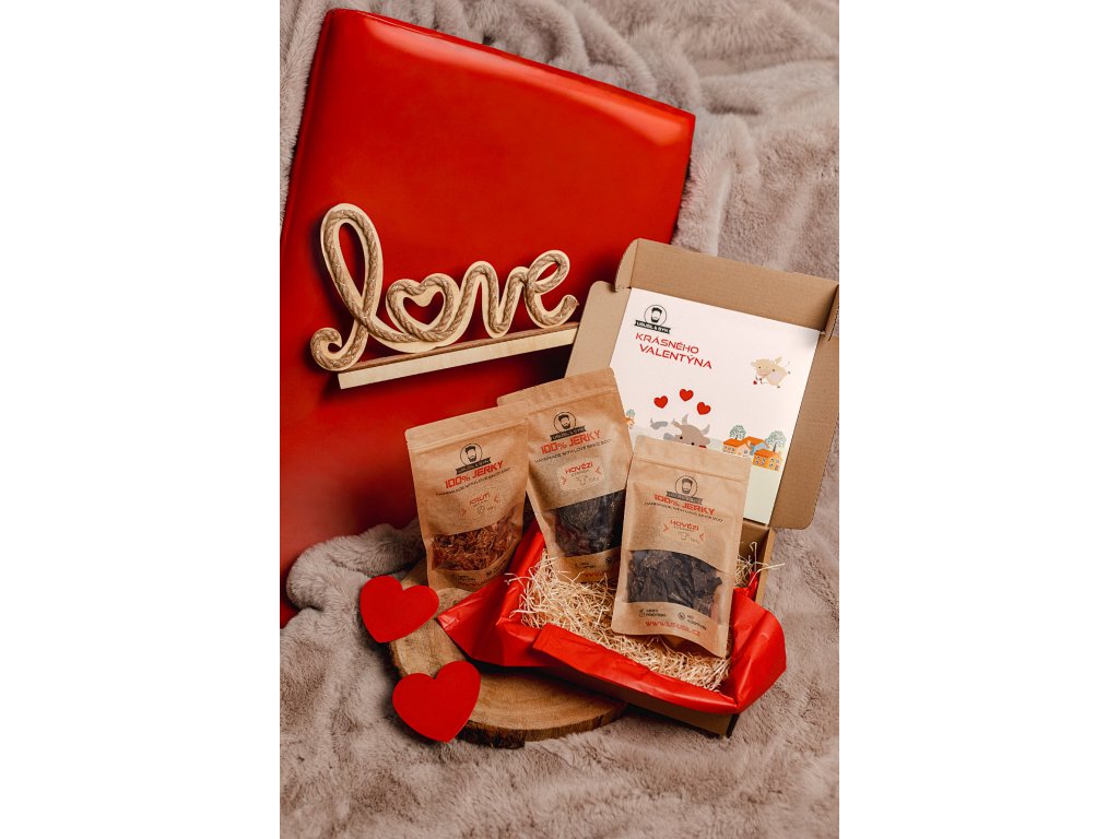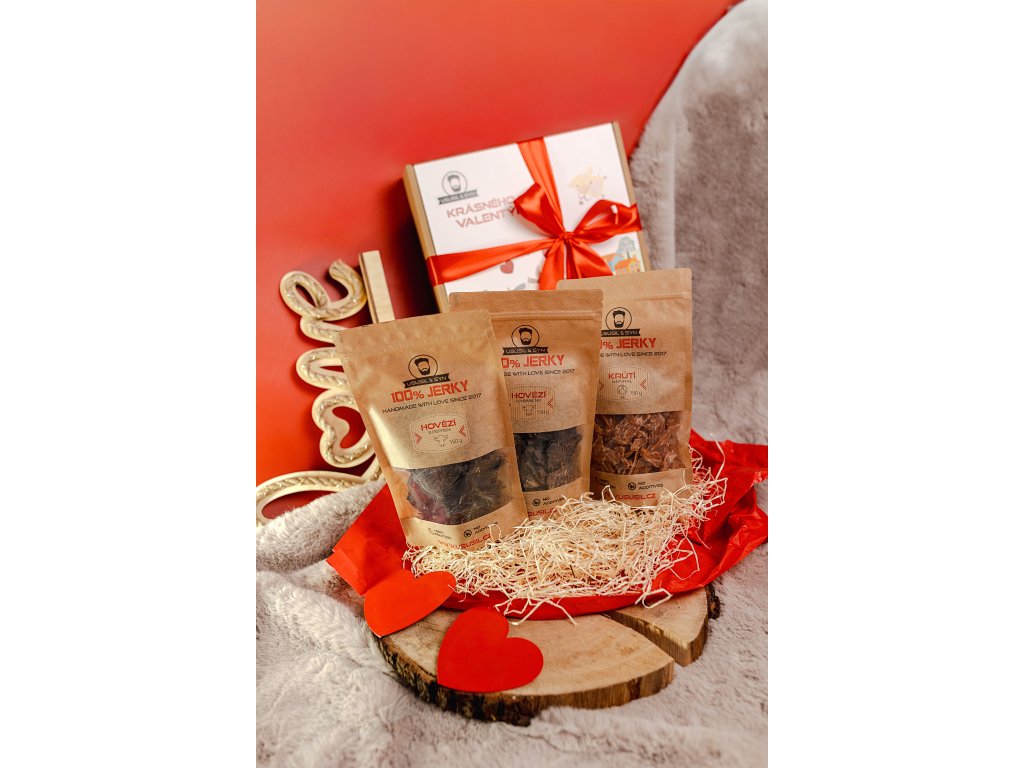MILUJEM, ĎAKUJEM, Prajem... Povedz to mäsom! Porcia 3x 150 g Jerky v darčekovej kazete presne na mieru obdarovanému šťastlivcovi. Teraz v novom valentínskom "kabáte".