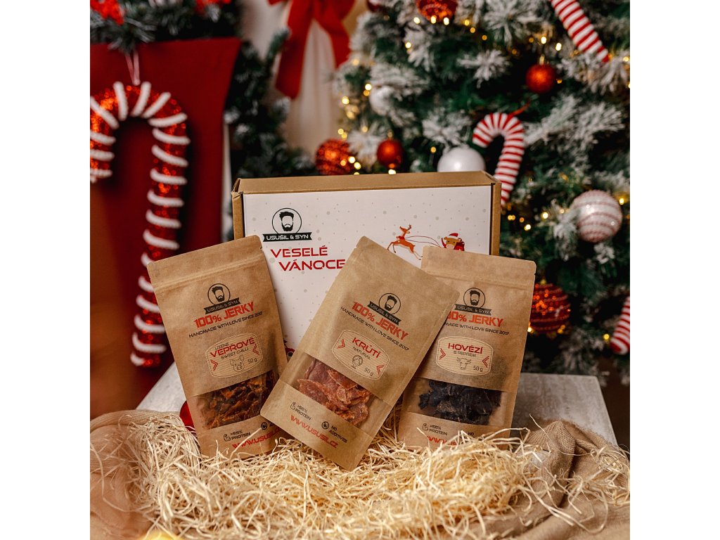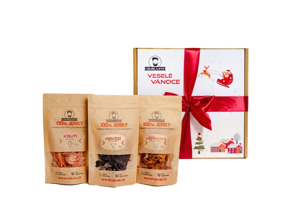 MILUJEM, ĎAKUJEM, Prajem... Povedz to mäsom! Porcia 3x 50 g Jerky v darčekovej kazete presne na mieru obdarovanému šťastlivcovi. Teraz v novom vianočnom "kabáte".