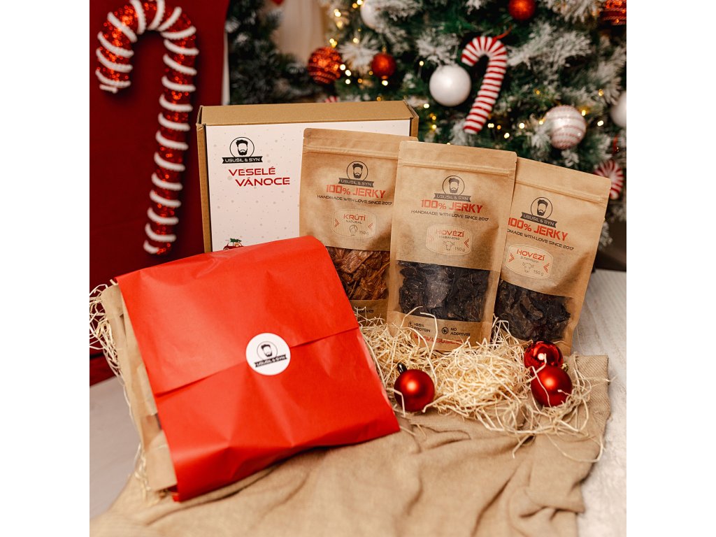 MILUJEM, ĎAKUJEM, Prajem... Povedz to mäsom! Porcia 3x 150 g Jerky v darčekovej kazete presne na mieru obdarovanému šťastlivcovi. Teraz v novom vianočnom "kabáte".